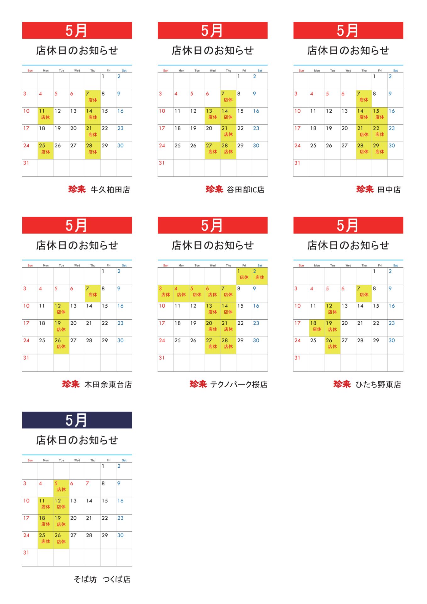 各店の定休日のお知らせです。