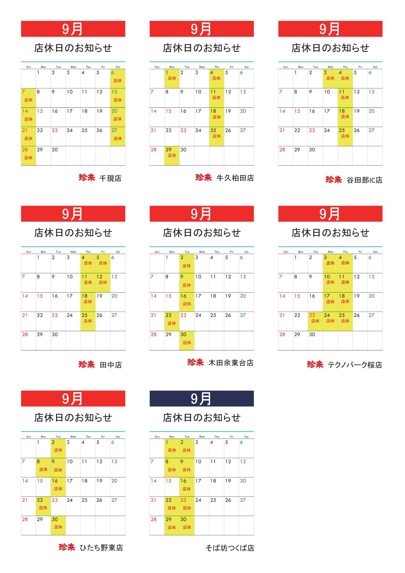 各店の定休日のお知らせです。